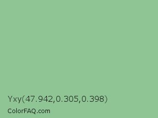 Yxy 47.942,0.305,0.398 Color is a light green color and the nearest color is Dark Sea Green #8fbc8f. Hex code #8fc595 and RGB value is rgb(143,197,149). In RGB color space, this color is composed of 56% red, 77% green, 58% blue, In CMYK color space, this color is composed of 27% cyan, 0% magenta, 24% yellow , 23% black , In HSL color space, this color has a hue angle of 127° , 32% saturation and 67% lightness.