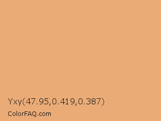 Yxy 47.95,0.419,0.387 Color is a light orange color and the nearest color is Middle Yellow Red #ecb176. Hex code #eaab77 and RGB value is rgb(234,171,119). In RGB color space, this color is composed of 92% red, 67% green, 47% blue, In CMYK color space, this color is composed of 0% cyan, 27% magenta, 49% yellow , 8% black , In HSL color space, this color has a hue angle of 27° , 73% saturation and 69% lightness.