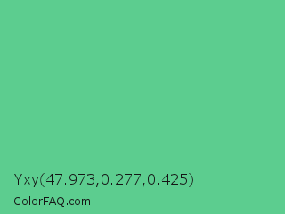 Yxy 47.973,0.277,0.425 Color is a normal green color and the nearest color is Ocean Green #48bf91. Hex code #5ccd8f and RGB value is rgb(92,205,143). In RGB color space, this color is composed of 36% red, 80% green, 56% blue, In CMYK color space, this color is composed of 55% cyan, 0% magenta, 30% yellow , 20% black , In HSL color space, this color has a hue angle of 147° , 53% saturation and 58% lightness.