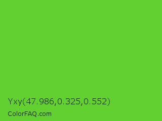 Yxy 47.986,0.325,0.552 Color is a normal green color and the nearest color is Green RYB #66b032. Hex code #63d031 and RGB value is rgb(99,208,49). In RGB color space, this color is composed of 39% red, 82% green, 19% blue, In CMYK color space, this color is composed of 52% cyan, 0% magenta, 76% yellow , 18% black , In HSL color space, this color has a hue angle of 101° , 63% saturation and 50% lightness.