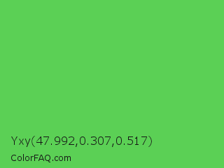 Yxy 47.992,0.307,0.517 Color is a normal green color and the nearest color is Mantis #74c365. Hex code #5bd055 and RGB value is rgb(91,208,85). In RGB color space, this color is composed of 36% red, 82% green, 33% blue, In CMYK color space, this color is composed of 56% cyan, 0% magenta, 59% yellow , 18% black , In HSL color space, this color has a hue angle of 117° , 57% saturation and 57% lightness.
