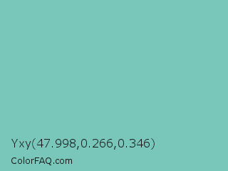 Yxy 47.998,0.266,0.346 Color is a light cyan color and the nearest color is Neptune #7cb7bb. Hex code #79c6ba and RGB value is rgb(121,198,186). In RGB color space, this color is composed of 47% red, 78% green, 73% blue, In CMYK color space, this color is composed of 39% cyan, 0% magenta, 6% yellow , 22% black , In HSL color space, this color has a hue angle of 171° , 40% saturation and 63% lightness.