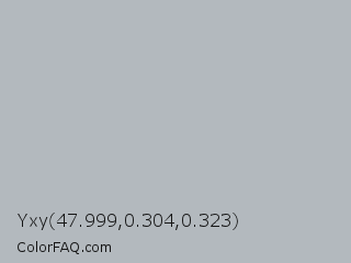 Yxy 47.999,0.304,0.323 Color is a light blue color and the nearest color is Ash Gray #b2beb5. Hex code #b3b9be and RGB value is rgb(179,185,190). In RGB color space, this color is composed of 70% red, 73% green, 75% blue, In CMYK color space, this color is composed of 6% cyan, 3% magenta, 0% yellow , 25% black , In HSL color space, this color has a hue angle of 207° , 8% saturation and 72% lightness.