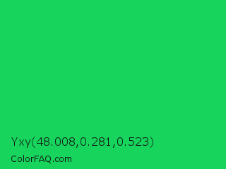 Yxy 48.008,0.281,0.523 Color is a normal green color and the nearest color is Malachite #0bda51. Hex code #16d45c and RGB value is rgb(22,212,92). In RGB color space, this color is composed of 9% red, 83% green, 36% blue, In CMYK color space, this color is composed of 90% cyan, 0% magenta, 57% yellow , 17% black , In HSL color space, this color has a hue angle of 142° , 81% saturation and 46% lightness.