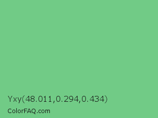 Yxy 48.011,0.294,0.434 Color is a light green color and the nearest color is De York #7ac488. Hex code #71cb86 and RGB value is rgb(113,203,134). In RGB color space, this color is composed of 44% red, 80% green, 53% blue, In CMYK color space, this color is composed of 44% cyan, 0% magenta, 34% yellow , 20% black , In HSL color space, this color has a hue angle of 134° , 46% saturation and 62% lightness.