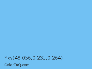 Yxy 48.056,0.231,0.264 Color is a light blue color and the nearest color is Maya Blue #73c2fb. Hex code #71c1f3 and RGB value is rgb(113,193,243). In RGB color space, this color is composed of 44% red, 76% green, 95% blue, In CMYK color space, this color is composed of 53% cyan, 21% magenta, 0% yellow , 5% black , In HSL color space, this color has a hue angle of 203° , 84% saturation and 70% lightness.