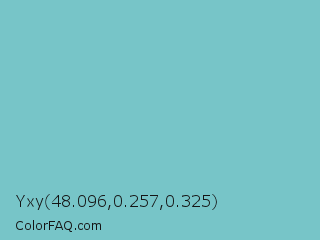 Yxy 48.096,0.257,0.325 Color is a light cyan color and the nearest color is Downy #6fd0c5. Hex code #77c5c8 and RGB value is rgb(119,197,200). In RGB color space, this color is composed of 47% red, 77% green, 78% blue, In CMYK color space, this color is composed of 41% cyan, 2% magenta, 0% yellow , 22% black , In HSL color space, this color has a hue angle of 182° , 42% saturation and 63% lightness.
