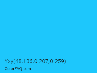 Yxy 48.136,0.207,0.259 Color is a normal blue color and the nearest color is Spiro Disco Ball #0fc0fc. Hex code #1dc7fc and RGB value is rgb(29,199,252). In RGB color space, this color is composed of 11% red, 78% green, 99% blue, In CMYK color space, this color is composed of 88% cyan, 21% magenta, 0% yellow , 1% black , In HSL color space, this color has a hue angle of 194° , 97% saturation and 55% lightness.
