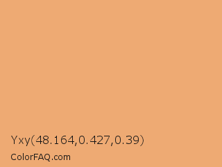 Yxy 48.164,0.427,0.39 Color is a light orange color and the nearest color is Middle Yellow Red #ecb176. Hex code #eeaa73 and RGB value is rgb(238,170,115). In RGB color space, this color is composed of 93% red, 67% green, 45% blue, In CMYK color space, this color is composed of 0% cyan, 29% magenta, 52% yellow , 7% black , In HSL color space, this color has a hue angle of 27° , 78% saturation and 69% lightness.
