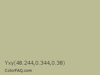 Yxy 48.244,0.344,0.38 Color is a light yellow color and the nearest color is Sage #bcb88a. Hex code #bbbb94 and RGB value is rgb(187,187,148). In RGB color space, this color is composed of 73% red, 73% green, 58% blue, In CMYK color space, this color is composed of 0% cyan, 0% magenta, 21% yellow , 27% black , In HSL color space, this color has a hue angle of 60° , 22% saturation and 66% lightness.