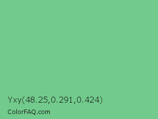 Yxy 48.25,0.291,0.424 Color is a light green color and the nearest color is De York #7ac488. Hex code #72cb8c and RGB value is rgb(114,203,140). In RGB color space, this color is composed of 45% red, 80% green, 55% blue, In CMYK color space, this color is composed of 44% cyan, 0% magenta, 31% yellow , 20% black , In HSL color space, this color has a hue angle of 138° , 46% saturation and 62% lightness.