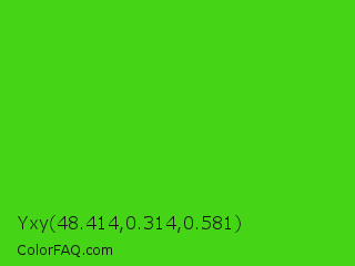 Yxy 48.414,0.314,0.581 Color is a normal green color and the nearest color is Harlequin Green #46cb18. Hex code #45d416 and RGB value is rgb(69,212,22). In RGB color space, this color is composed of 27% red, 83% green, 9% blue, In CMYK color space, this color is composed of 67% cyan, 0% magenta, 90% yellow , 17% black , In HSL color space, this color has a hue angle of 105° , 81% saturation and 46% lightness.