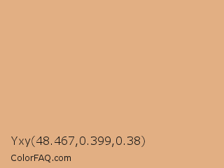 Yxy 48.467,0.399,0.38 Color is a light orange color and the nearest color is Tumbleweed #deaa88. Hex code #e2af83 and RGB value is rgb(226,175,131). In RGB color space, this color is composed of 89% red, 69% green, 51% blue, In CMYK color space, this color is composed of 0% cyan, 23% magenta, 42% yellow , 11% black , In HSL color space, this color has a hue angle of 28° , 62% saturation and 70% lightness.