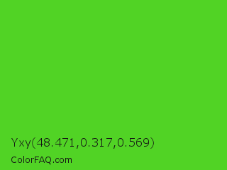 Yxy 48.471,0.317,0.569 Color is a normal green color and the nearest color is Harlequin Green #46cb18. Hex code #51d325 and RGB value is rgb(81,211,37). In RGB color space, this color is composed of 32% red, 83% green, 15% blue, In CMYK color space, this color is composed of 62% cyan, 0% magenta, 82% yellow , 17% black , In HSL color space, this color has a hue angle of 105° , 70% saturation and 49% lightness.