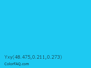 Yxy 48.475,0.211,0.273 Color is a normal cyan color and the nearest color is Spiro Disco Ball #0fc0fc. Hex code #1dc9f2 and RGB value is rgb(29,201,242). In RGB color space, this color is composed of 11% red, 79% green, 95% blue, In CMYK color space, this color is composed of 88% cyan, 17% magenta, 0% yellow , 5% black , In HSL color space, this color has a hue angle of 192° , 89% saturation and 53% lightness.