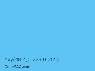 Yxy 48.4,0.223,0.265 Color is a light blue color and the nearest color is Maya Blue #73c2fb. Hex code #5dc4f5 and RGB value is rgb(93,196,245). In RGB color space, this color is composed of 36% red, 77% green, 96% blue, In CMYK color space, this color is composed of 62% cyan, 20% magenta, 0% yellow , 4% black , In HSL color space, this color has a hue angle of 199° , 88% saturation and 66% lightness.