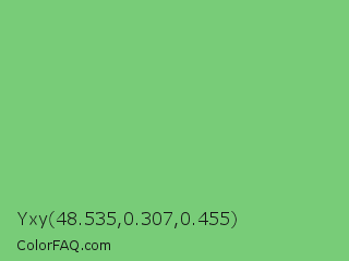 Yxy 48.535,0.307,0.455 Color is a light green color and the nearest color is Pastel Green #77dd77. Hex code #78cc78 and RGB value is rgb(120,204,120). In RGB color space, this color is composed of 47% red, 80% green, 47% blue, In CMYK color space, this color is composed of 41% cyan, 0% magenta, 41% yellow , 20% black , In HSL color space, this color has a hue angle of 120° , 45% saturation and 64% lightness.