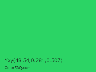 Yxy 48.54,0.281,0.507 Color is a normal green color and the nearest color is UFO Green #3cd070. Hex code #2bd465 and RGB value is rgb(43,212,101). In RGB color space, this color is composed of 17% red, 83% green, 40% blue, In CMYK color space, this color is composed of 80% cyan, 0% magenta, 52% yellow , 17% black , In HSL color space, this color has a hue angle of 141° , 66% saturation and 50% lightness.