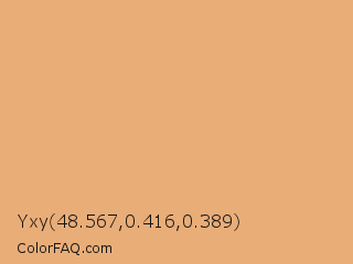 Yxy 48.567,0.416,0.389 Color is a light orange color and the nearest color is Middle Yellow Red #ecb176. Hex code #e9ad78 and RGB value is rgb(233,173,120). In RGB color space, this color is composed of 91% red, 68% green, 47% blue, In CMYK color space, this color is composed of 0% cyan, 26% magenta, 48% yellow , 9% black , In HSL color space, this color has a hue angle of 28° , 72% saturation and 69% lightness.