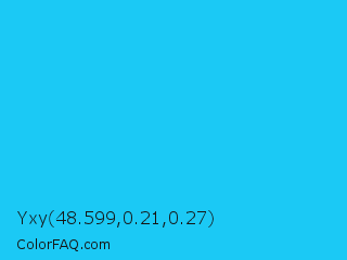 Yxy 48.599,0.21,0.27 Color is a normal cyan color and the nearest color is Spiro Disco Ball #0fc0fc. Hex code #1bc9f5 and RGB value is rgb(27,201,245). In RGB color space, this color is composed of 11% red, 79% green, 96% blue, In CMYK color space, this color is composed of 89% cyan, 18% magenta, 0% yellow , 4% black , In HSL color space, this color has a hue angle of 192° , 92% saturation and 53% lightness.