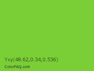 Yxy 48.62,0.34,0.536 Color is a normal green color and the nearest color is Atlantis #97cd2d. Hex code #7ace36 and RGB value is rgb(122,206,54). In RGB color space, this color is composed of 48% red, 81% green, 21% blue, In CMYK color space, this color is composed of 41% cyan, 0% magenta, 74% yellow , 19% black , In HSL color space, this color has a hue angle of 93° , 61% saturation and 51% lightness.