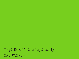 Yxy 48.641,0.343,0.554 Color is a normal green color and the nearest color is Lima #76bd17. Hex code #77cf1e and RGB value is rgb(119,207,30). In RGB color space, this color is composed of 47% red, 81% green, 12% blue, In CMYK color space, this color is composed of 43% cyan, 0% magenta, 86% yellow , 19% black , In HSL color space, this color has a hue angle of 90° , 75% saturation and 46% lightness.