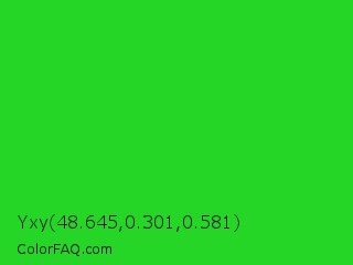 Yxy 48.645,0.301,0.581 Color is a normal green color and the nearest color is Lime Green #32cd32. Hex code #26d626 and RGB value is rgb(38,214,38). In RGB color space, this color is composed of 15% red, 84% green, 15% blue, In CMYK color space, this color is composed of 82% cyan, 0% magenta, 82% yellow , 16% black , In HSL color space, this color has a hue angle of 120° , 70% saturation and 49% lightness.
