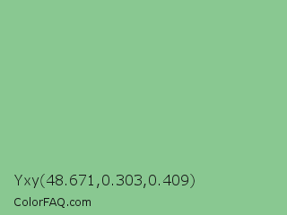 Yxy 48.671,0.303,0.409 Color is a light green color and the nearest color is Dark Sea Green #8fbc8f. Hex code #89c891 and RGB value is rgb(137,200,145). In RGB color space, this color is composed of 54% red, 78% green, 57% blue, In CMYK color space, this color is composed of 32% cyan, 0% magenta, 28% yellow , 22% black , In HSL color space, this color has a hue angle of 128° , 36% saturation and 66% lightness.