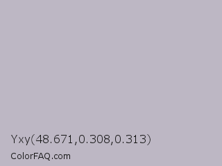 Yxy 48.671,0.308,0.313 Color is a light violet color and the nearest color is Chatelle #bdb3c7. Hex code #bdb7c4 and RGB value is rgb(189,183,196). In RGB color space, this color is composed of 74% red, 72% green, 77% blue, In CMYK color space, this color is composed of 4% cyan, 7% magenta, 0% yellow , 23% black , In HSL color space, this color has a hue angle of 268° , 10% saturation and 74% lightness.