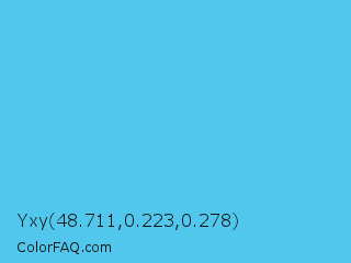 Yxy 48.711,0.223,0.278 Color is a light blue color and the nearest color is Picton Blue #45b1e8. Hex code #51c7ed and RGB value is rgb(81,199,237). In RGB color space, this color is composed of 32% red, 78% green, 93% blue, In CMYK color space, this color is composed of 66% cyan, 16% magenta, 0% yellow , 7% black , In HSL color space, this color has a hue angle of 195° , 81% saturation and 62% lightness.