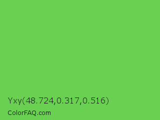 Yxy 48.724,0.317,0.516 Color is a normal green color and the nearest color is Mantis #74c365. Hex code #69d052 and RGB value is rgb(105,208,82). In RGB color space, this color is composed of 41% red, 82% green, 32% blue, In CMYK color space, this color is composed of 50% cyan, 0% magenta, 61% yellow , 18% black , In HSL color space, this color has a hue angle of 109° , 57% saturation and 57% lightness.