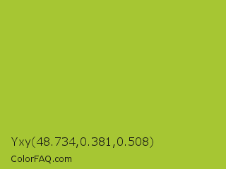 Yxy 48.734,0.381,0.508 Color is a normal lime color and the nearest color is Android Green #a4c639. Hex code #a6c633 and RGB value is rgb(166,198,51). In RGB color space, this color is composed of 65% red, 78% green, 20% blue, In CMYK color space, this color is composed of 16% cyan, 0% magenta, 74% yellow , 22% black , In HSL color space, this color has a hue angle of 73° , 59% saturation and 49% lightness.