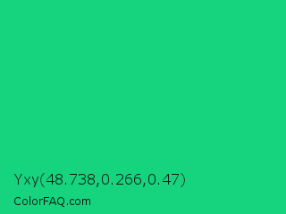 Yxy 48.738,0.266,0.47 Color is a normal green color and the nearest color is Mountain Meadow Crayola #1ab385. Hex code #16d47d and RGB value is rgb(22,212,125). In RGB color space, this color is composed of 9% red, 83% green, 49% blue, In CMYK color space, this color is composed of 90% cyan, 0% magenta, 41% yellow , 17% black , In HSL color space, this color has a hue angle of 153° , 81% saturation and 46% lightness.