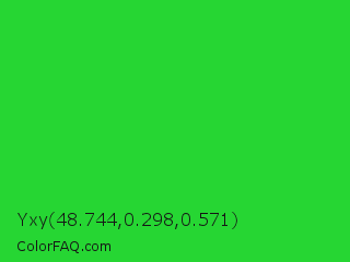 Yxy 48.744,0.298,0.571 Color is a normal green color and the nearest color is Lime Green #32cd32. Hex code #26d633 and RGB value is rgb(38,214,51). In RGB color space, this color is composed of 15% red, 84% green, 20% blue, In CMYK color space, this color is composed of 82% cyan, 0% magenta, 76% yellow , 16% black , In HSL color space, this color has a hue angle of 124° , 70% saturation and 49% lightness.