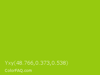 Yxy 48.766,0.373,0.538 Color is a normal lime color and the nearest color is Pistachio Green #9dc209. Hex code #96ca0f and RGB value is rgb(150,202,15). In RGB color space, this color is composed of 59% red, 79% green, 6% blue, In CMYK color space, this color is composed of 26% cyan, 0% magenta, 93% yellow , 21% black , In HSL color space, this color has a hue angle of 77° , 86% saturation and 43% lightness.