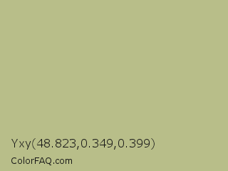 Yxy 48.823,0.349,0.399 Color is a light yellow color and the nearest color is Sage #bcb88a. Hex code #b8be89 and RGB value is rgb(184,190,137). In RGB color space, this color is composed of 72% red, 75% green, 54% blue, In CMYK color space, this color is composed of 3% cyan, 0% magenta, 28% yellow , 25% black , In HSL color space, this color has a hue angle of 67° , 29% saturation and 64% lightness.