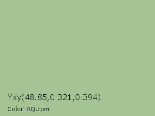 Yxy 48.85,0.321,0.394 Color is a light green color and the nearest color is Norway #a8bd9f. Hex code #a2c394 and RGB value is rgb(162,195,148). In RGB color space, this color is composed of 64% red, 76% green, 58% blue, In CMYK color space, this color is composed of 17% cyan, 0% magenta, 24% yellow , 24% black , In HSL color space, this color has a hue angle of 102° , 28% saturation and 67% lightness.