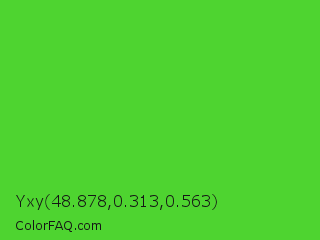 Yxy 48.878,0.313,0.563 Color is a normal green color and the nearest color is Harlequin Green #46cb18. Hex code #4ed430 and RGB value is rgb(78,212,48). In RGB color space, this color is composed of 31% red, 83% green, 19% blue, In CMYK color space, this color is composed of 63% cyan, 0% magenta, 77% yellow , 17% black , In HSL color space, this color has a hue angle of 109° , 66% saturation and 51% lightness.