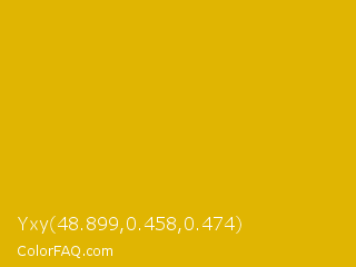 Yxy 48.899,0.458,0.474 Color is a normal yellow color and the nearest color is Galliano #dcb20c. Hex code #e0b502 and RGB value is rgb(224,181,2). In RGB color space, this color is composed of 88% red, 71% green, 1% blue, In CMYK color space, this color is composed of 0% cyan, 19% magenta, 99% yellow , 12% black , In HSL color space, this color has a hue angle of 48° , 98% saturation and 44% lightness.