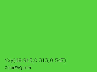 Yxy 48.915,0.313,0.547 Color is a normal green color and the nearest color is Lime Green #32cd32. Hex code #56d33e and RGB value is rgb(86,211,62). In RGB color space, this color is composed of 34% red, 83% green, 24% blue, In CMYK color space, this color is composed of 59% cyan, 0% magenta, 71% yellow , 17% black , In HSL color space, this color has a hue angle of 110° , 63% saturation and 54% lightness.