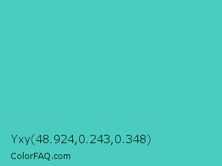 Yxy 48.924,0.243,0.348 Color is a normal cyan color and the nearest color is Medium Turquoise #48d1cc. Hex code #4acdc0 and RGB value is rgb(74,205,192). In RGB color space, this color is composed of 29% red, 80% green, 75% blue, In CMYK color space, this color is composed of 64% cyan, 0% magenta, 6% yellow , 20% black , In HSL color space, this color has a hue angle of 174° , 57% saturation and 55% lightness.