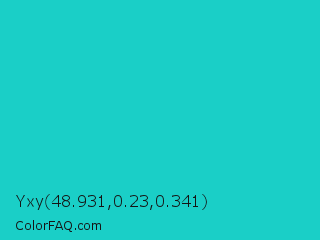 Yxy 48.931,0.23,0.341 Color is a normal cyan color and the nearest color is Java #1fc2c2. Hex code #1acfc7 and RGB value is rgb(26,207,199). In RGB color space, this color is composed of 10% red, 81% green, 78% blue, In CMYK color space, this color is composed of 87% cyan, 0% magenta, 4% yellow , 19% black , In HSL color space, this color has a hue angle of 177° , 78% saturation and 46% lightness.