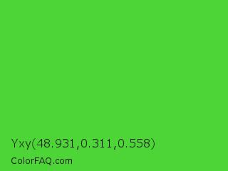 Yxy 48.931,0.311,0.558 Color is a normal green color and the nearest color is Lime Green #32cd32. Hex code #4dd436 and RGB value is rgb(77,212,54). In RGB color space, this color is composed of 30% red, 83% green, 21% blue, In CMYK color space, this color is composed of 64% cyan, 0% magenta, 75% yellow , 17% black , In HSL color space, this color has a hue angle of 111° , 65% saturation and 52% lightness.