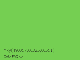 Yxy 49.017,0.325,0.511 Color is a normal green color and the nearest color is Mantis #74c365. Hex code #75cf52 and RGB value is rgb(117,207,82). In RGB color space, this color is composed of 46% red, 81% green, 32% blue, In CMYK color space, this color is composed of 43% cyan, 0% magenta, 60% yellow , 19% black , In HSL color space, this color has a hue angle of 103° , 57% saturation and 57% lightness.