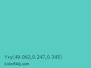 Yxy 49.062,0.247,0.345 Color is a normal cyan color and the nearest color is Sea Serpent #4bc7cf. Hex code #57ccc1 and RGB value is rgb(87,204,193). In RGB color space, this color is composed of 34% red, 80% green, 76% blue, In CMYK color space, this color is composed of 57% cyan, 0% magenta, 5% yellow , 20% black , In HSL color space, this color has a hue angle of 174° , 53% saturation and 57% lightness.