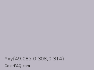 Yxy 49.085,0.308,0.314 Color is a light violet color and the nearest color is French Gray #bdbdc6. Hex code #bdb8c4 and RGB value is rgb(189,184,196). In RGB color space, this color is composed of 74% red, 72% green, 77% blue, In CMYK color space, this color is composed of 4% cyan, 6% magenta, 0% yellow , 23% black , In HSL color space, this color has a hue angle of 265° , 9% saturation and 75% lightness.