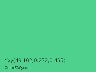 Yxy 49.102,0.272,0.435 Color is a normal green color and the nearest color is Ocean Green #48bf91. Hex code #4ed18d and RGB value is rgb(78,209,141). In RGB color space, this color is composed of 31% red, 82% green, 55% blue, In CMYK color space, this color is composed of 63% cyan, 0% magenta, 33% yellow , 18% black , In HSL color space, this color has a hue angle of 149° , 59% saturation and 56% lightness.