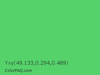 Yxy 49.133,0.294,0.489 Color is a normal green color and the nearest color is Emerald #50c878. Hex code #56d26b and RGB value is rgb(86,210,107). In RGB color space, this color is composed of 34% red, 82% green, 42% blue, In CMYK color space, this color is composed of 59% cyan, 0% magenta, 49% yellow , 18% black , In HSL color space, this color has a hue angle of 130° , 58% saturation and 58% lightness.