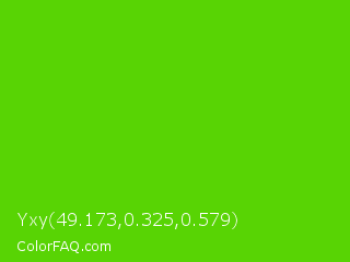 Yxy 49.173,0.325,0.579 Color is a normal green color and the nearest color is Harlequin Green #46cb18. Hex code #58d404 and RGB value is rgb(88,212,4). In RGB color space, this color is composed of 35% red, 83% green, 2% blue, In CMYK color space, this color is composed of 58% cyan, 0% magenta, 98% yellow , 17% black , In HSL color space, this color has a hue angle of 96° , 96% saturation and 42% lightness.