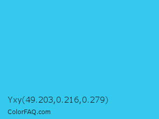 Yxy 49.203,0.216,0.279 Color is a normal cyan color and the nearest color is Scooter #2ebfd4. Hex code #34caef and RGB value is rgb(52,202,239). In RGB color space, this color is composed of 20% red, 79% green, 94% blue, In CMYK color space, this color is composed of 78% cyan, 15% magenta, 0% yellow , 6% black , In HSL color space, this color has a hue angle of 192° , 85% saturation and 57% lightness.